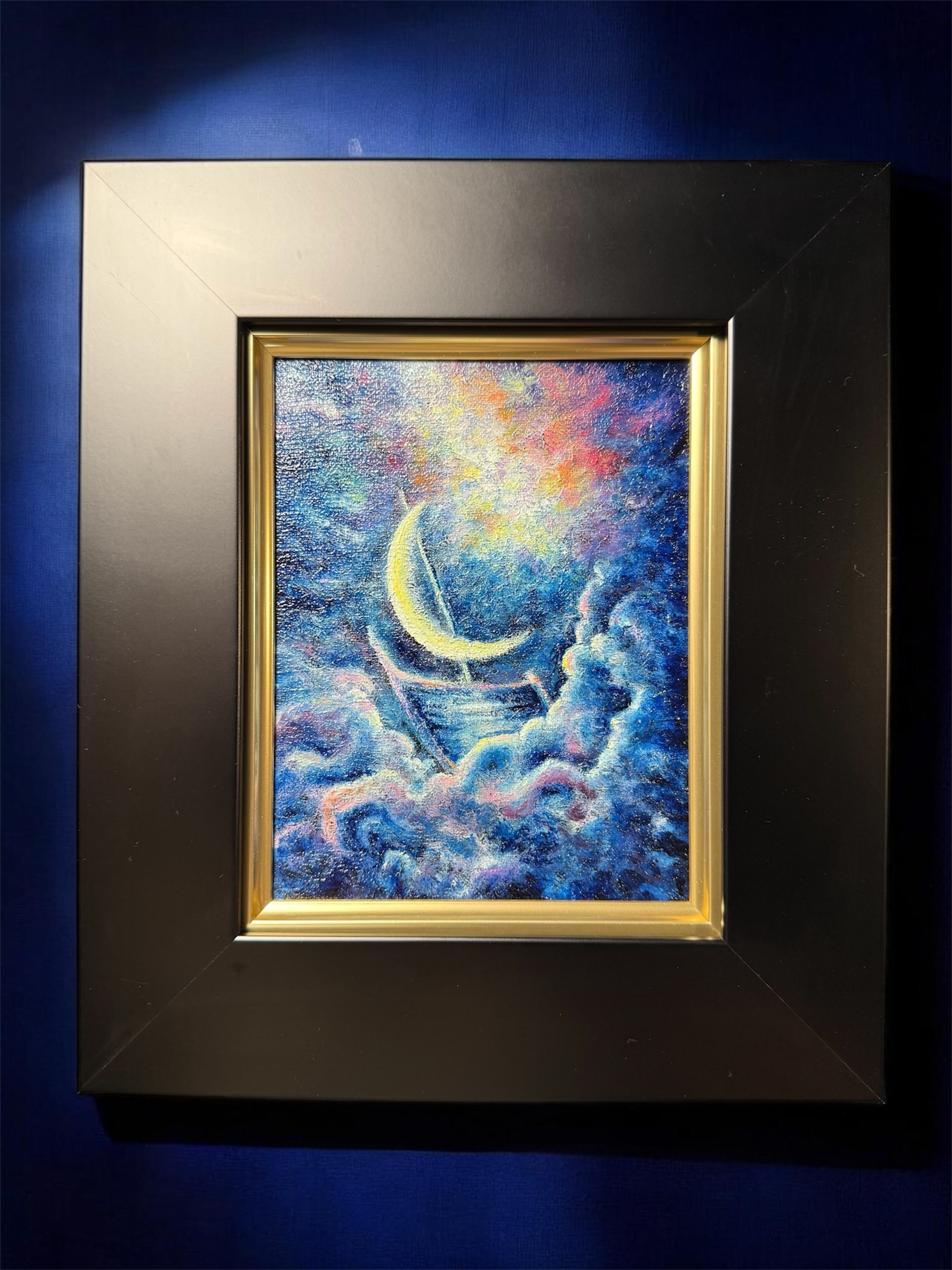 「月の航海」 【額装不要の方へ】 額装なしでの発送も承ります。 その際は表示価格より10,000円差し引きますので、ご購入前にお問い合わせよりご連絡ください。 F0サイズ 油彩画 ※裏にはサインと制作年月日が入っています。